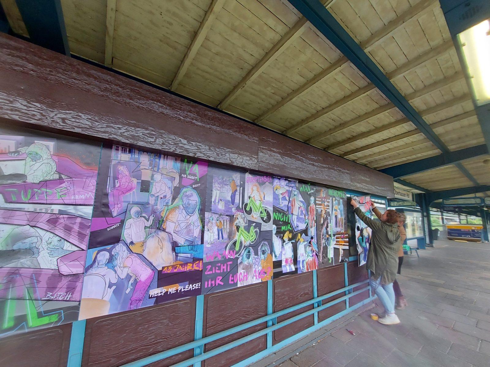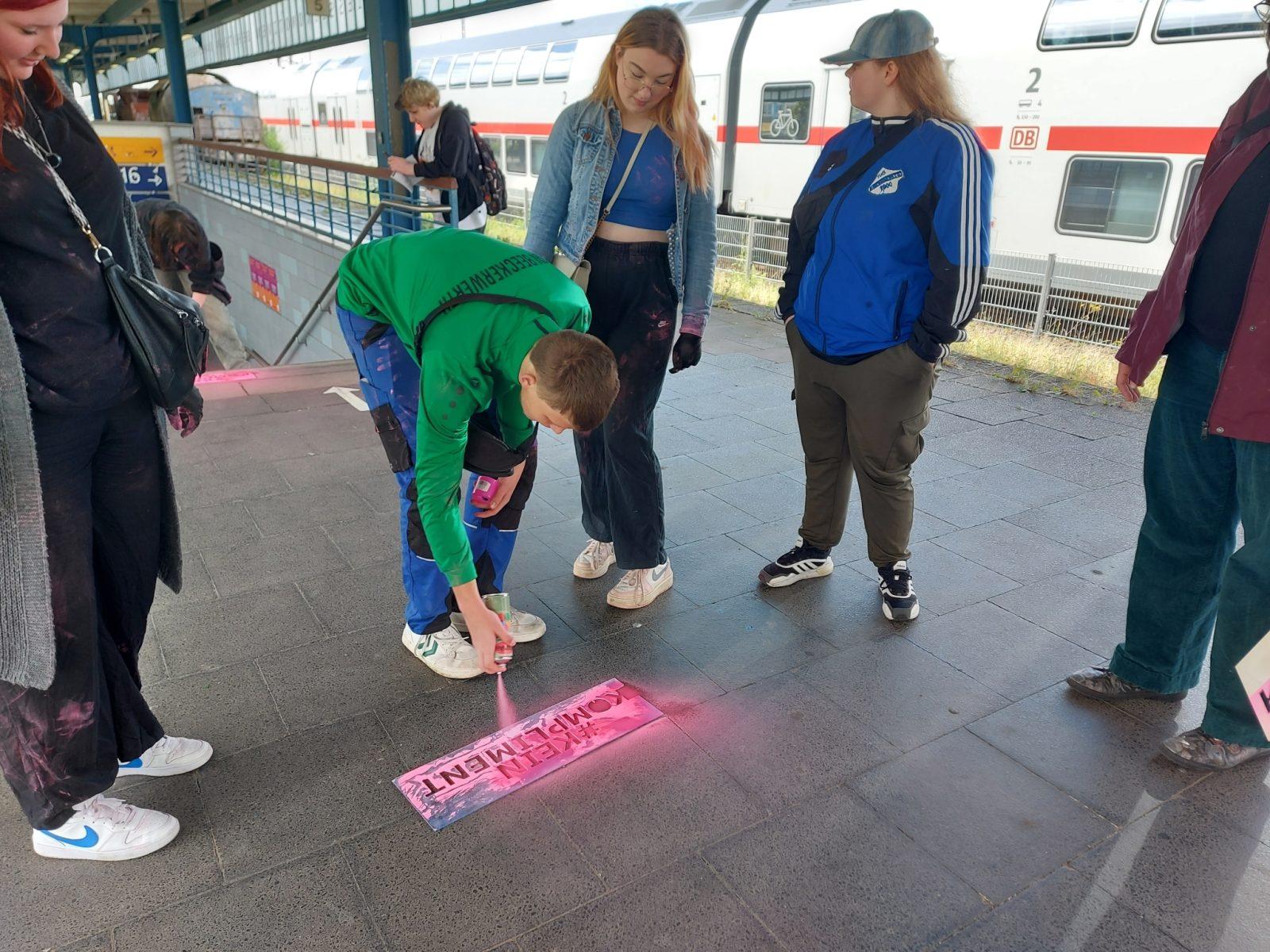 Auch unser wöchentliches Frauenfrühstück stand im Zeichen von #keinkompliment und bot Raum für Austausch und Vernetzung. Im Anschluss daran besuchte die Künstlerin Carina Hommel gemeinsam mit den Teilnehmerinnen und weiteren interessierten Menschen aus Oberhausen die Ausstellung auf dem Museumsbahnsteig. Beim Betrachten und Reflektieren der Bilder entstand ein intensiver Austausch über eigene Erfahrungen und Möglichkeiten des Selbstschutzes. Der Ausstellungsbesuch endete mit einer gemeinsamen Sprayaktion.