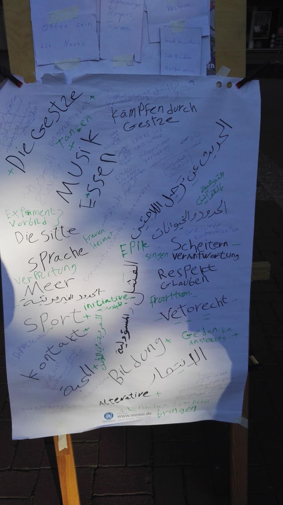 Und tags drauf: FR 20.08.: Integrationskurs, Teil 1: Integration und Kommunikation. Mit einem beeindruckenden Vortrag von Abdo Issa, anschließend weiteren Wortbeiträgen, Diskussion, Gespräch, Musik & Essen. Auf dem wunderschön sonnigen Friedensplatz, am Brunnen :)