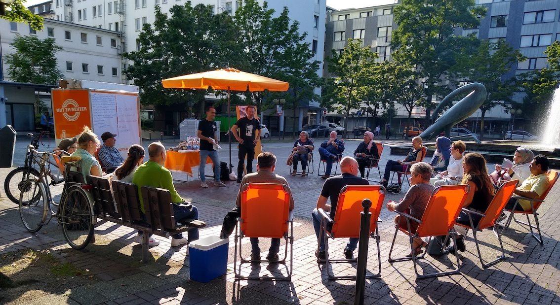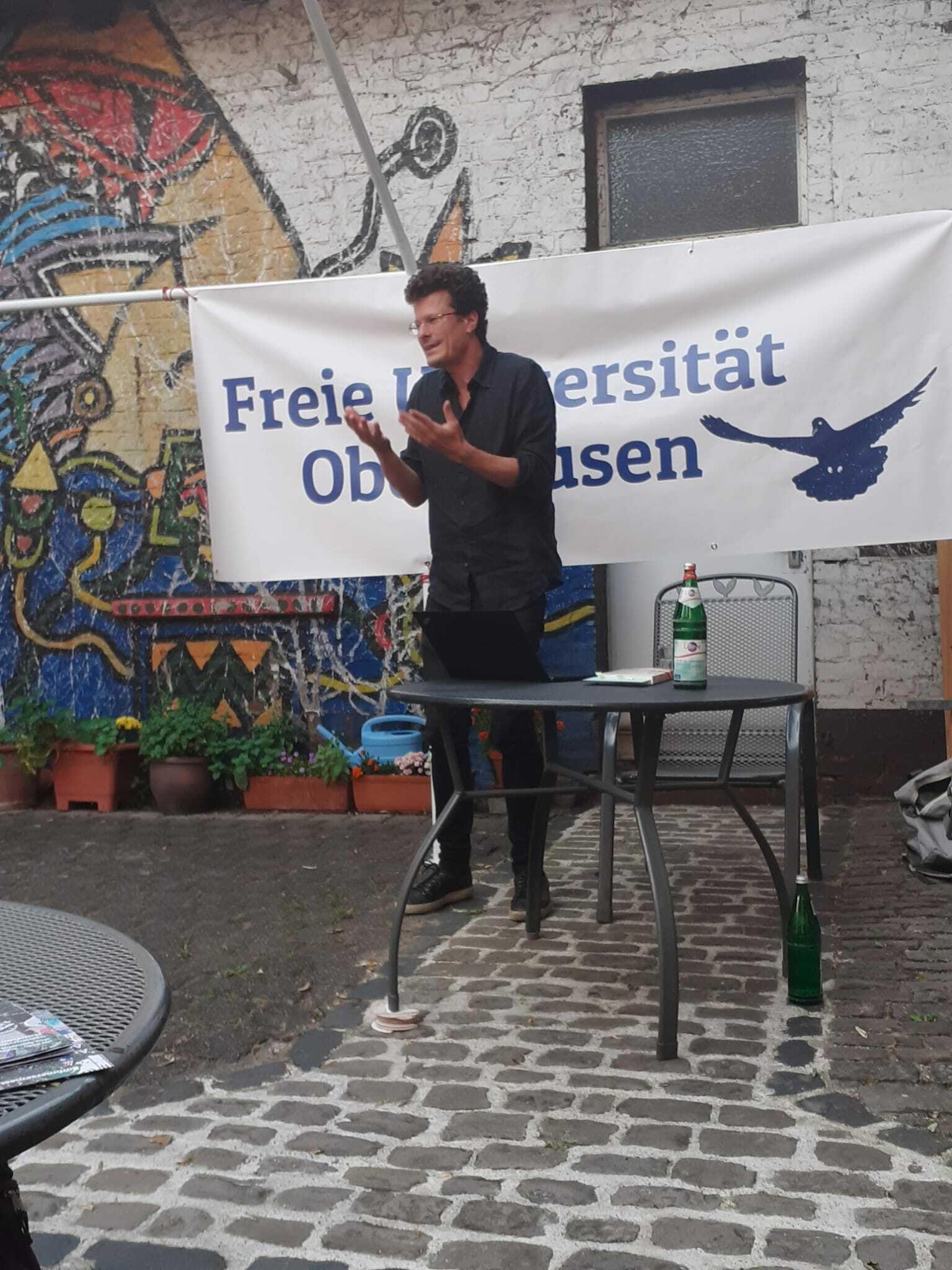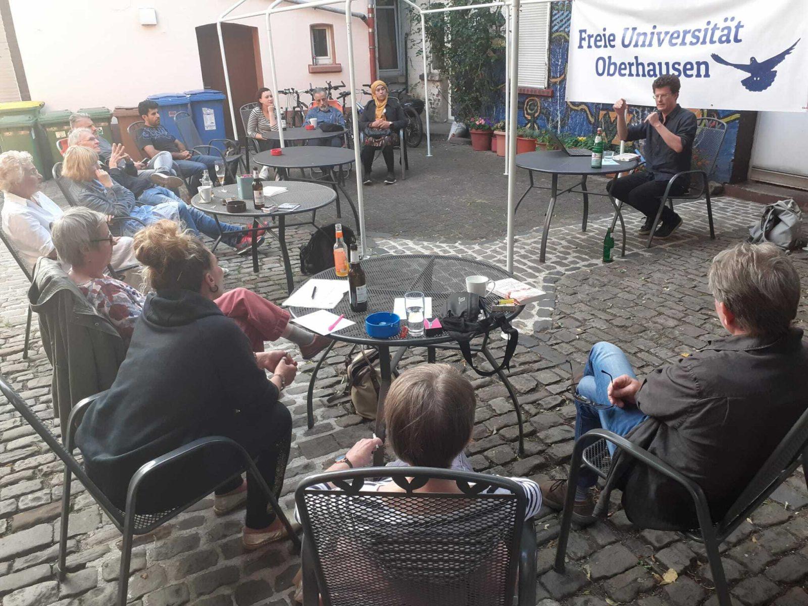 Zum Beginn der neuen Woche: endlich auch mal Quartiersgarten ohne Regen! Auf dem Museumsbahnsteig wurden die ersten Sounds of Oberhausen gesammelt, im Hof des Druckluft übte The Choir zum ersten Mal türkische Lieder ein – und im Garten K14 hatte unser Seminar Der gewöhnliche Lesende den Autor Andreas von Westphalen zu Gast, der mit dem Seminar sein Werk "Die Wiederentdeckung des Menschen" diskutierte.