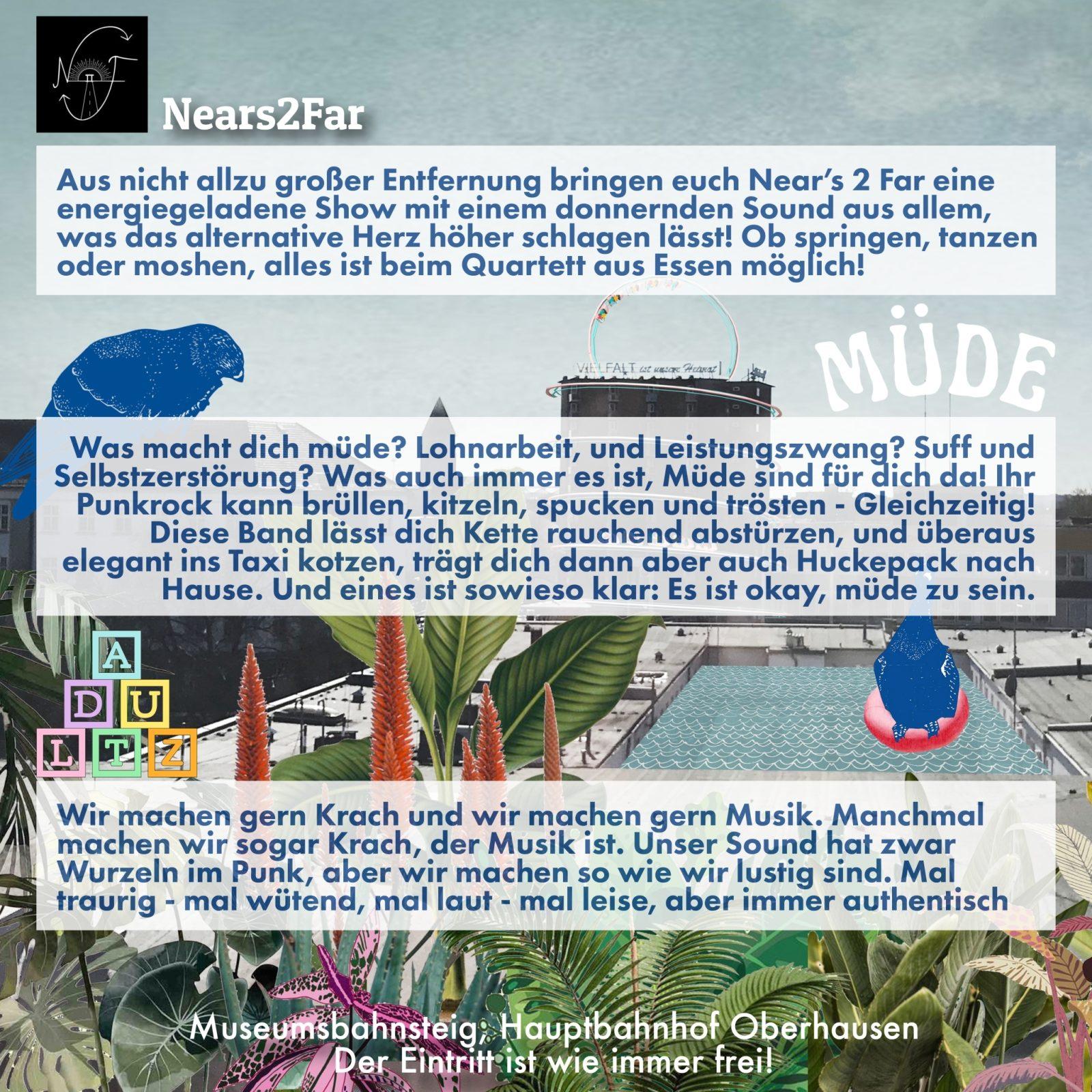 Aus nicht allzu großer Entfernung bringen euch Near's 2 Far eine energiegeladene Show mit einem donnernden Sound aus allem, was das alternative Herz höher schlagen lässt! Ob springen, tanzen oder moshen, alles ist beim Quartett aus Essen möglich!